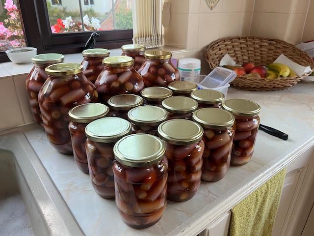Thanks again Les she ran in our fleet and went all over Europe alongside the modern trucks, even went to Bosnia during that conflict and was well known and respected, in a private collection now. This is the efforts of this afternoon below, 6 x half gallon jars and 12 x 2lb jars of pickled shallots, far better than onions IMHO. that said half done so more to go yet as they are popular.