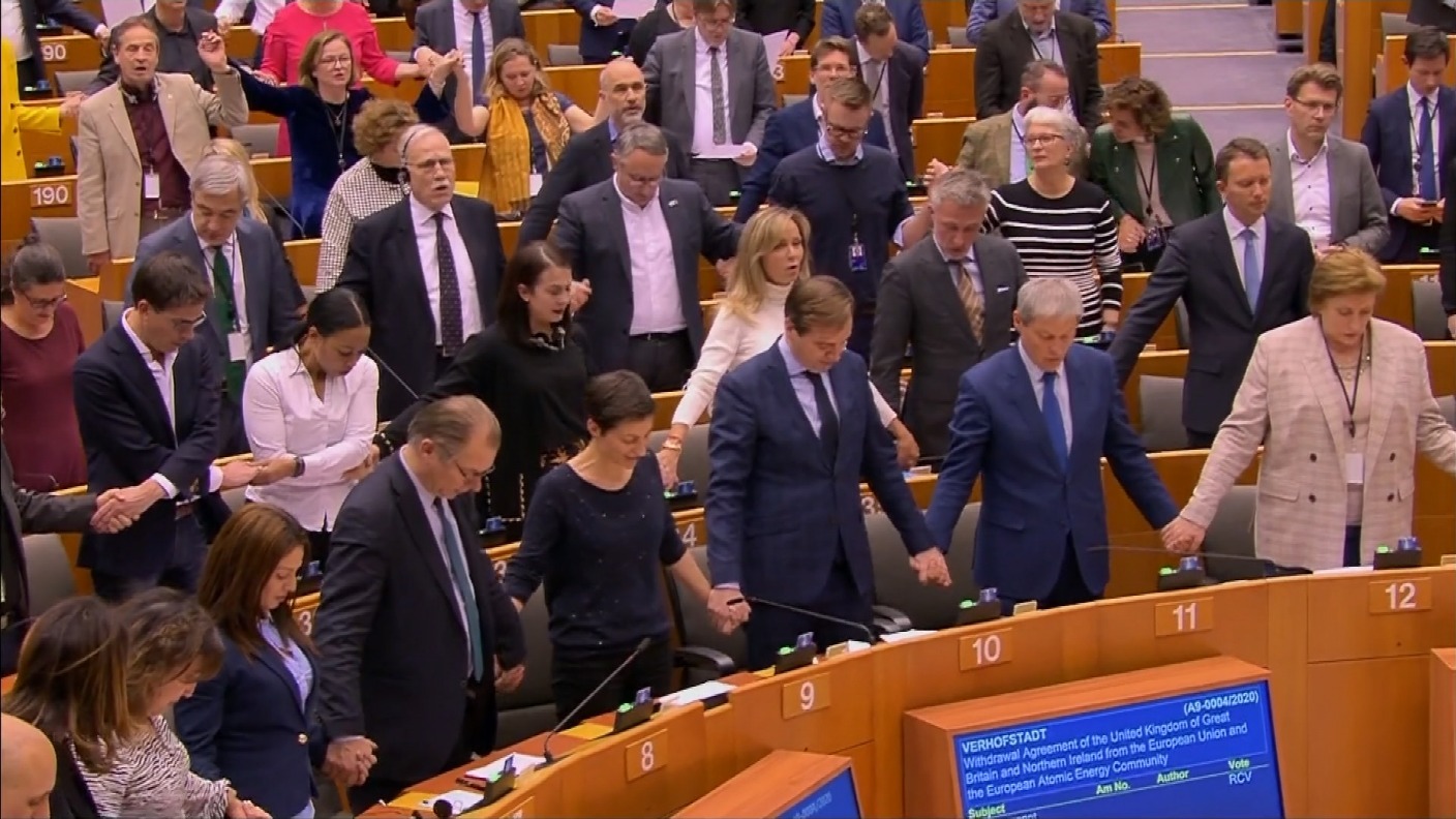 Straight after the vote was ratified - which paves the way for the UK to leave the bloc on January 31 - MEPs across the chamber stood up and held hands and sang Auld Lang Syne.