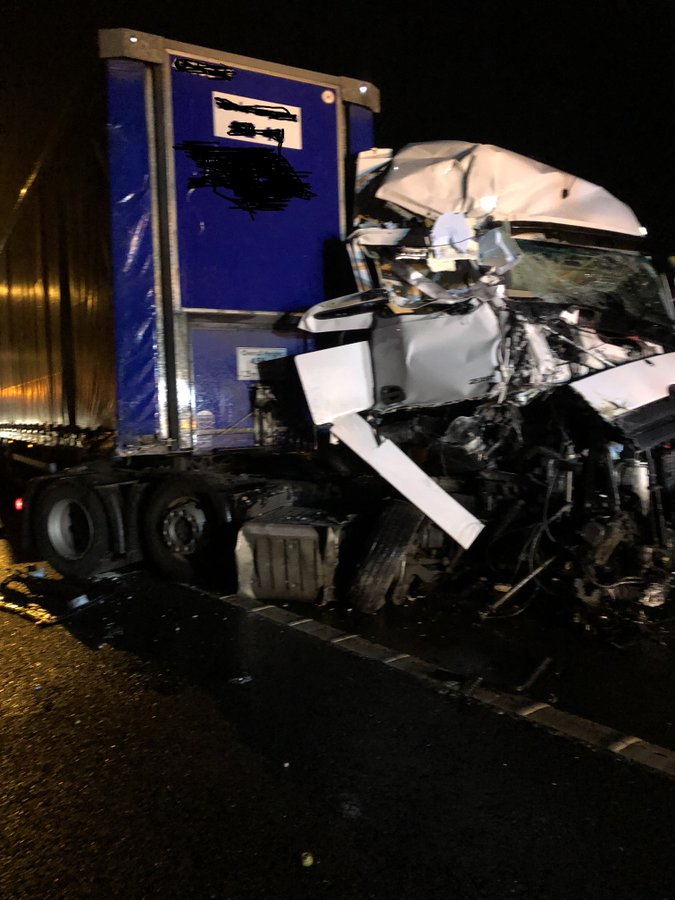 I drove past this going NB Saturday morning. Cars were on a recovery truck. An HGV recovery truck was hooked up to the other HGV involved and there was a crane there I’m guessing about to recover the one in the picture here.