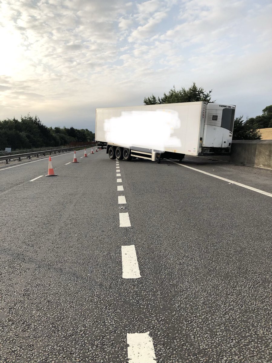 M2 jct 5 London bound. Detached trailer from lorry. Thankfully no other vehicles involved. Recovery being sorted.