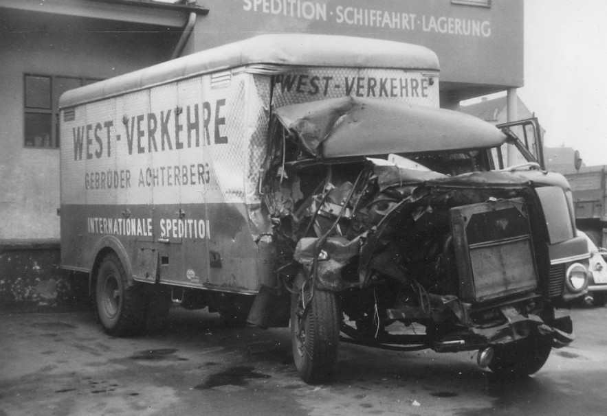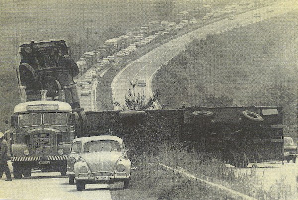 I had just left Bob Paul’s house after collecting my TIR Docs and running money and was on a ‘B’ road heading towards the A20 and then on to Dover. It had been raining and the road was greasy, I was going round a right hand bend and I felt the truck slide a bit so I backed off the accelerator and rode it around the bend but I drifted a bit wide and my drive wheels went over an electrical duct which collapsed. The drive wheels went down it and tried to stop the truck dead. This resulted in the near-side drive axle springs being broken and the truck flipped over on its side. I was loaded with cable drums of fibre optic cable destined for Damascus Airport, which were a bit top heavy and the whole lot went over on my drivers side. At first I thought that I had hit a tree and broken my drivers mirror, but I soon realised what had really happened and as the truck came to a halt on its side I was catapulted through the windscreen on to the dirt.