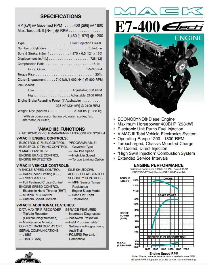 And here are the specifications of the Mack E7 engine, the output of which was upgreded to 480 bhp on some trucks.