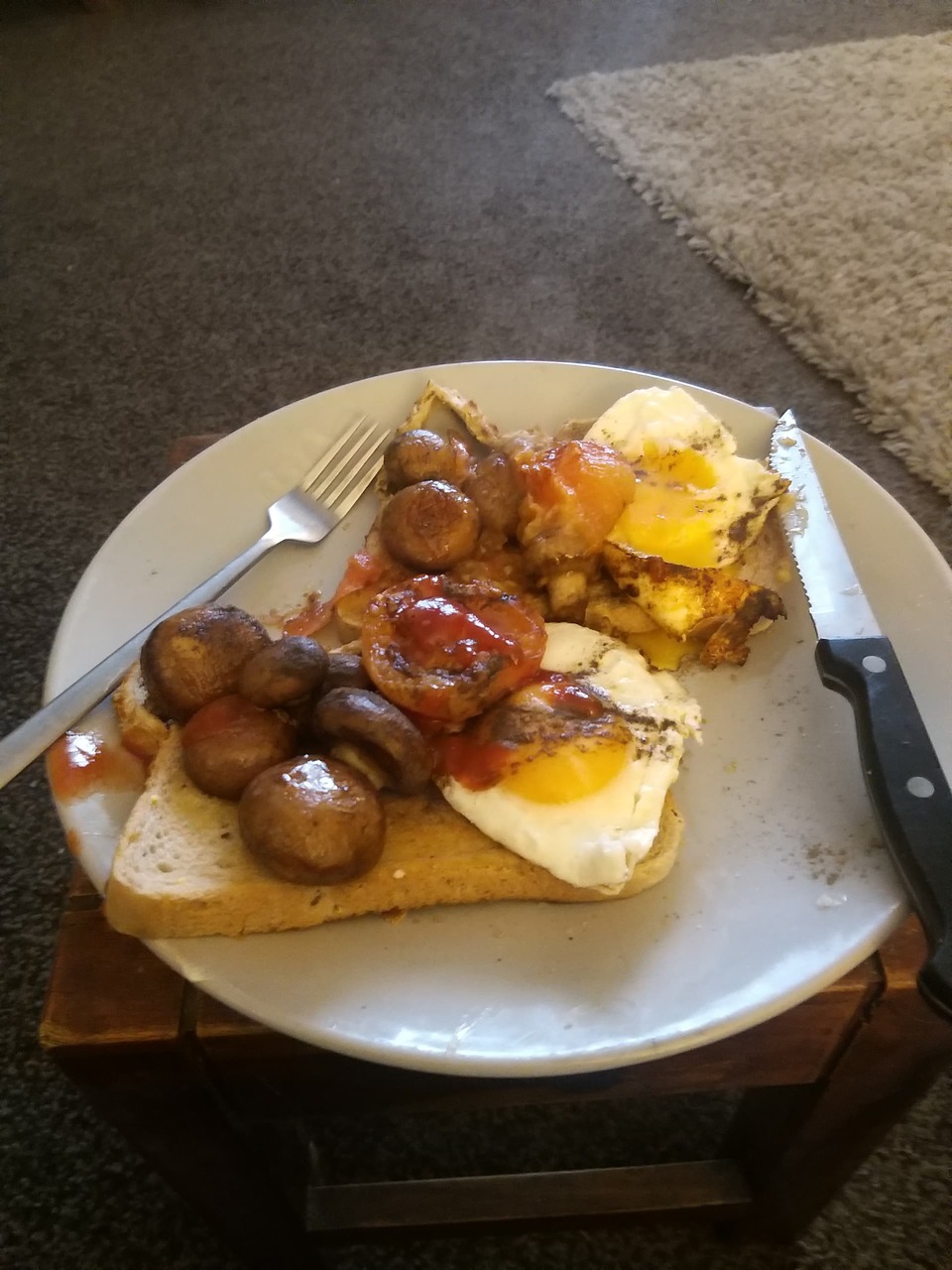 Just got back in, missed breakfast, so wife had a ‘‘Brunch’’ ready for me, mushrooms tomato and egg on toast.