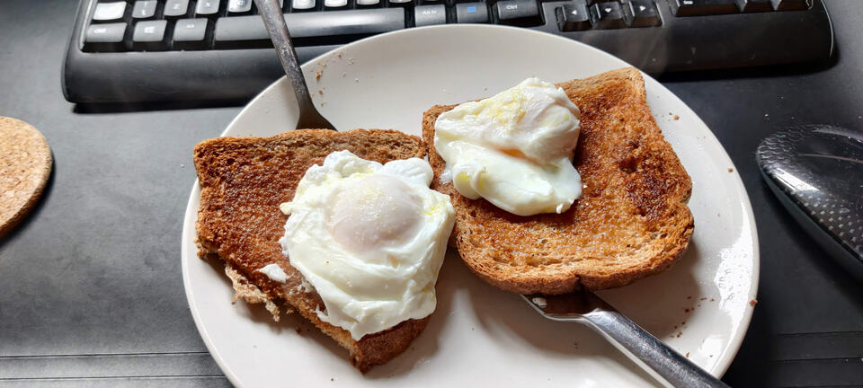 Two poached eggs on a door stopper piece of toast for brekkie this morning.
