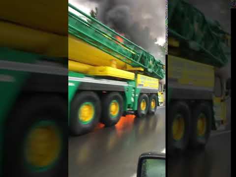 Last week one of these burst into flames on the Eastbound M62 just after J22, i.e. having ground its way up Windy Hill. It may be that the engine on these is more enclosed than on a normal unit to allow the crane to be mounted low, a red hot turbo and damaged or missing heat shielding is a possible cause.